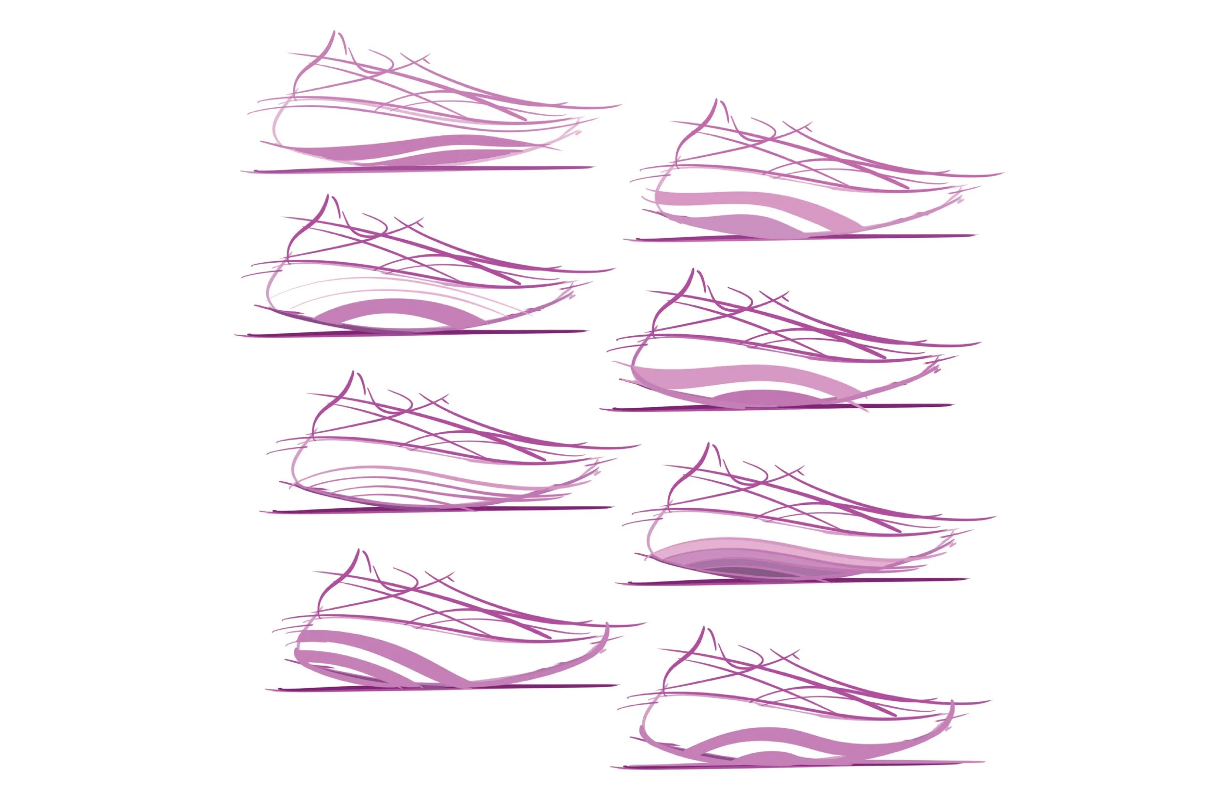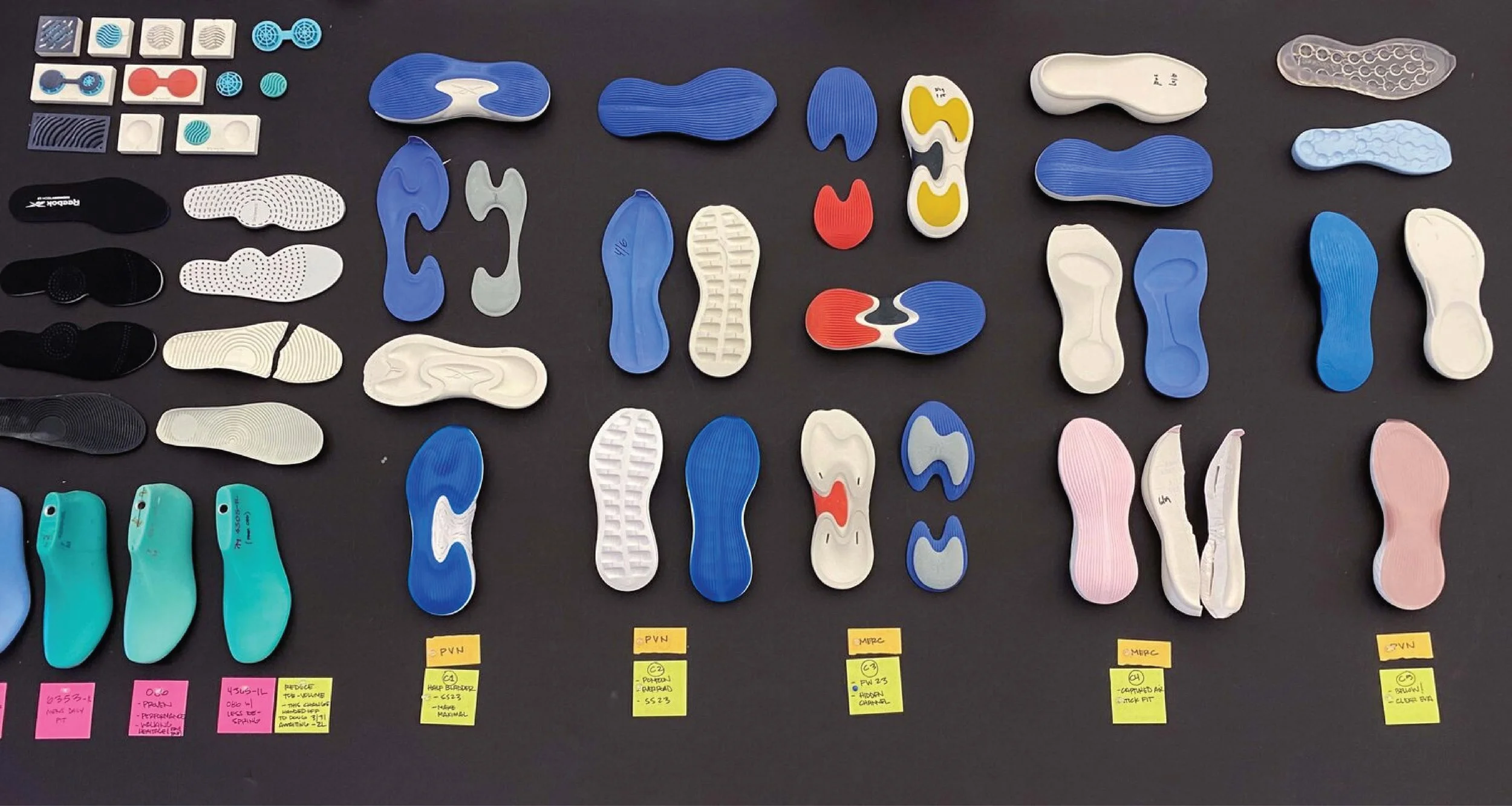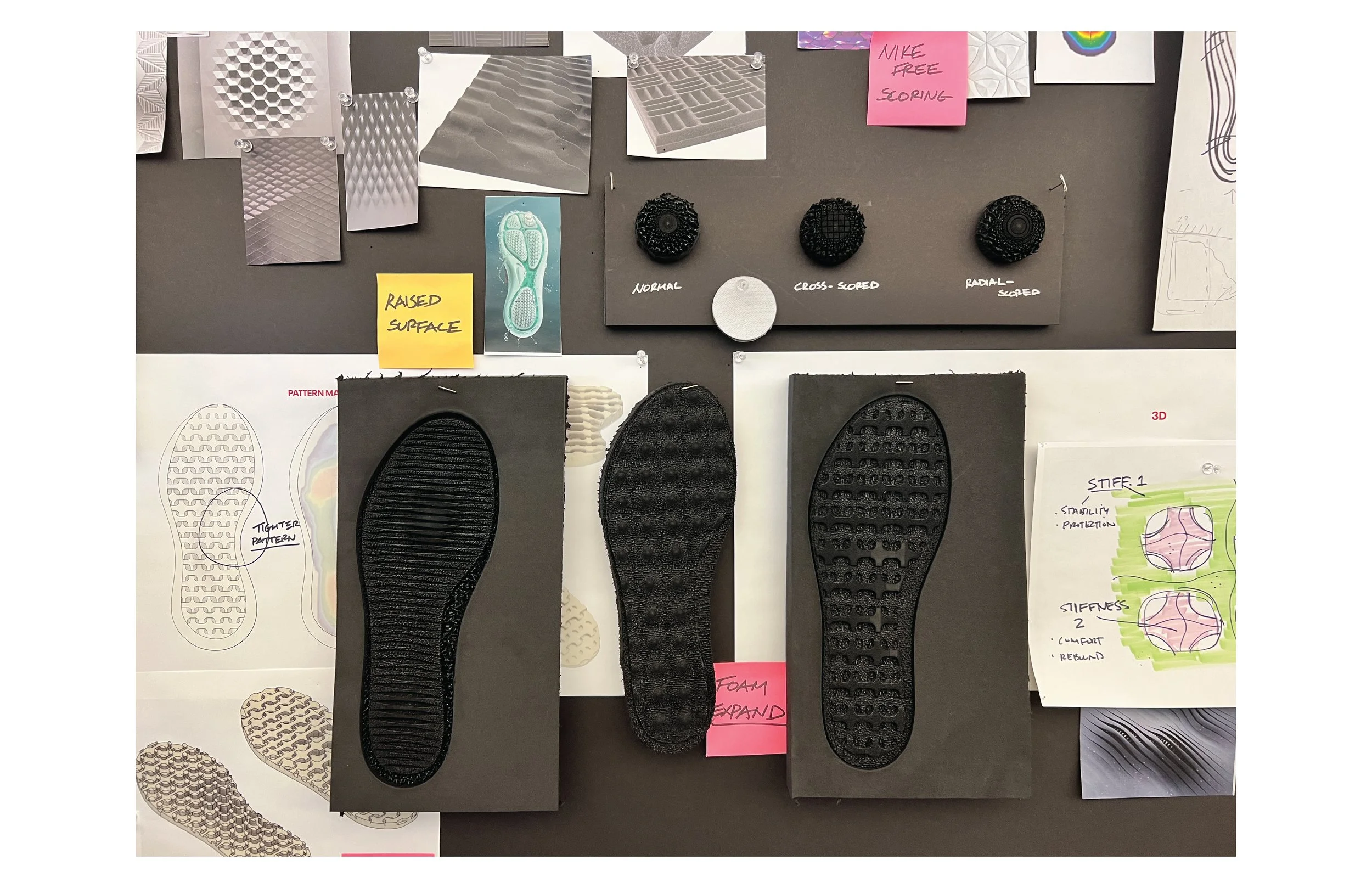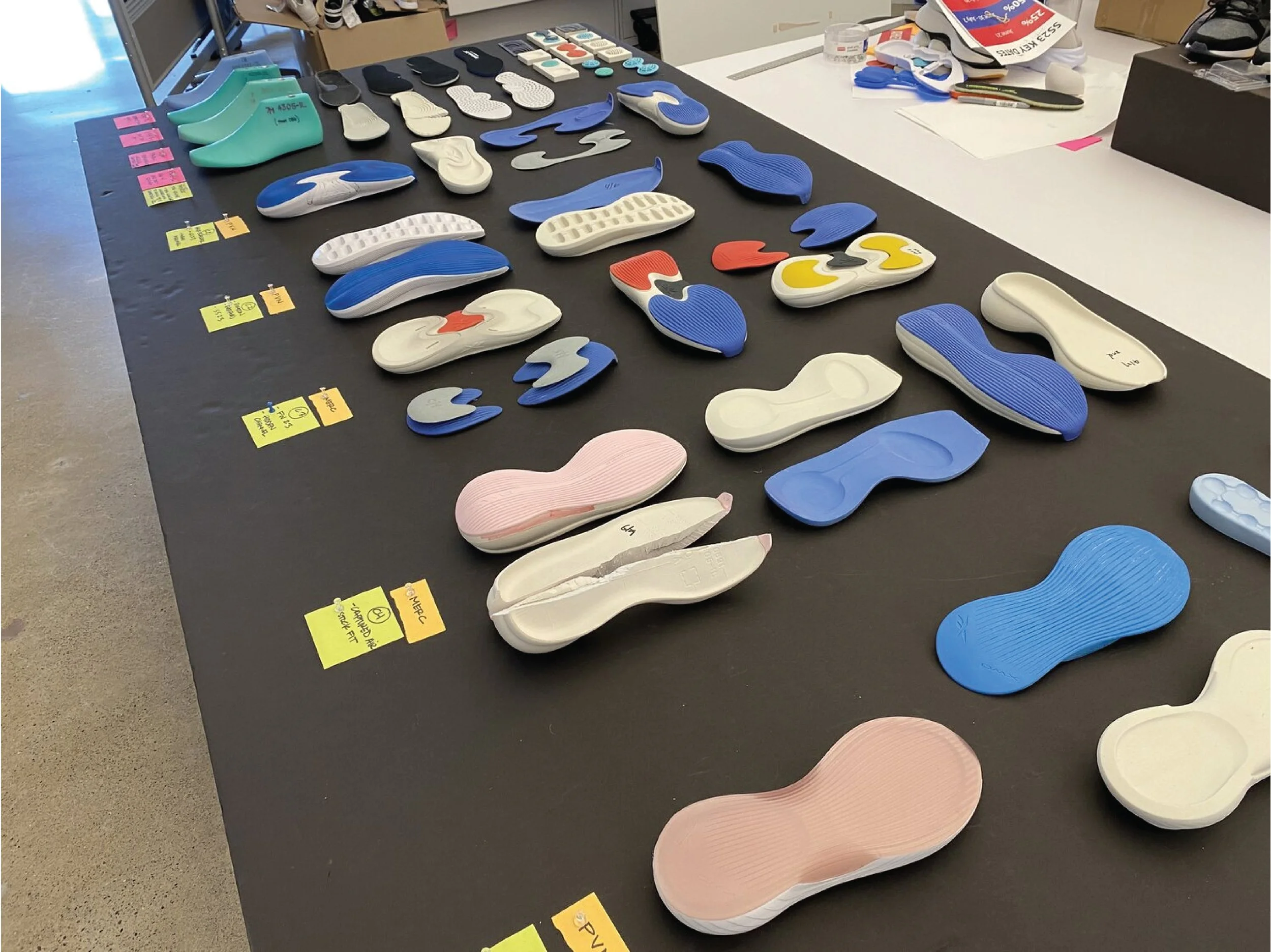 The sockliner design considers the flow language of DMX. We wanted to bring value and consideration to the immediate touchpoint of the foot. Explorations include die cut EVAs and molded sockliners.
